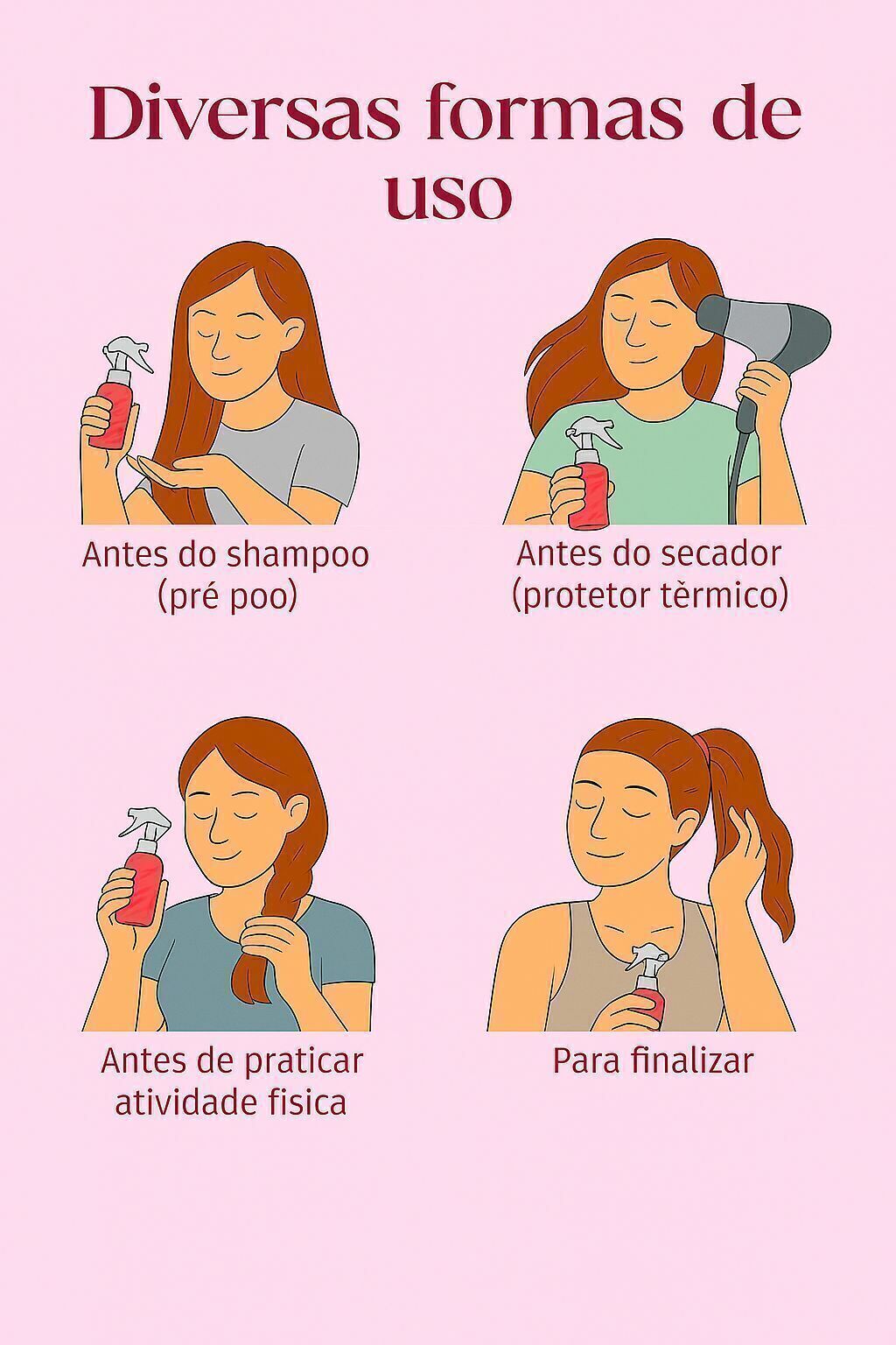 Modo de usar: Com os cabelos limpos e ainda úmidos, borrife o finalizador no comprimento e nas pontas dos fios. Finalize como de costume.