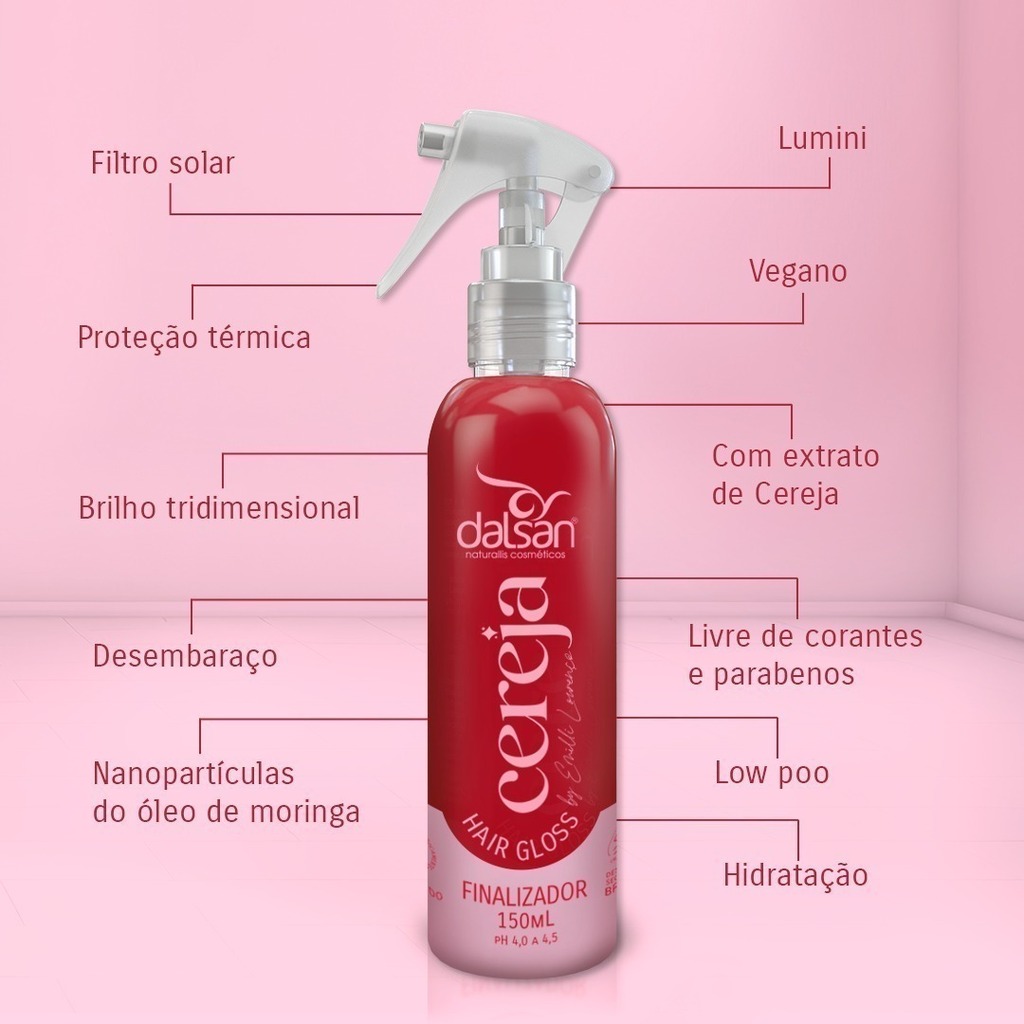 O Finalizador Dalsan Hair Gloss Cereja 150ml foi desenvolvido com ativos tecnológicos que proporcionam brilho tridimensional, condicionamento intenso, hidratação profunda e ação antifrizz, tudo em um único produto. Sua fórmula inclui óleo de moringa, rico em vitaminas A, C e E, além de ômegas 3, 6 e 9, oferecendo nutrientes e antioxidantes essenciais. O produto também oferece proteção térmica e solar, sendo ideal como finalizador, especialmente para modelagem dos fios no day after. O extrato de cereja ajuda a manter a hidratação e o brilho dos cabelos, garantindo fios saudáveis e radiantes.
